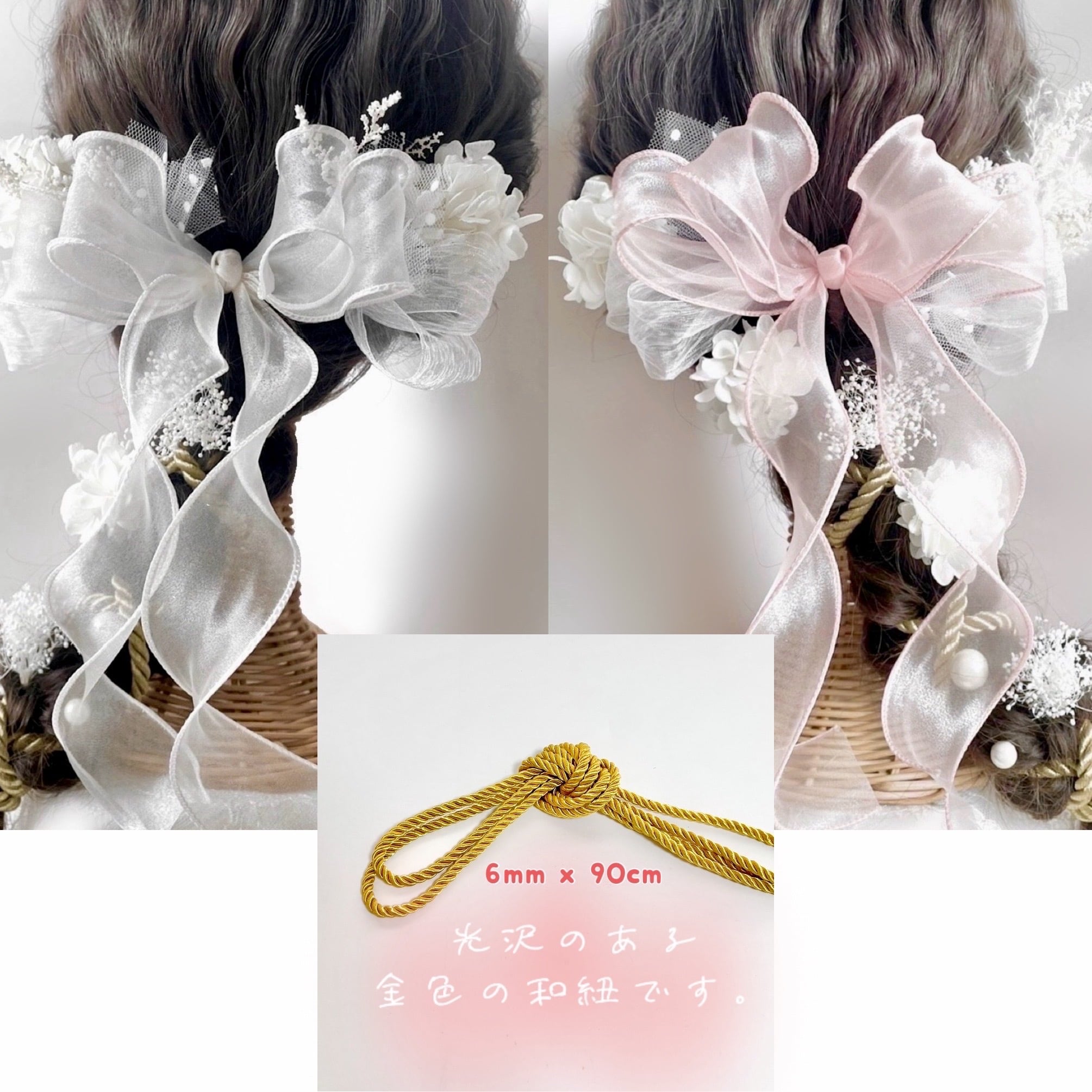 ・ふんわりオーガンジーリボン:淡いピンクのオーガンジーと繊細な白のチュールリボンを組み合わせ、優しい透け感を演出しました。