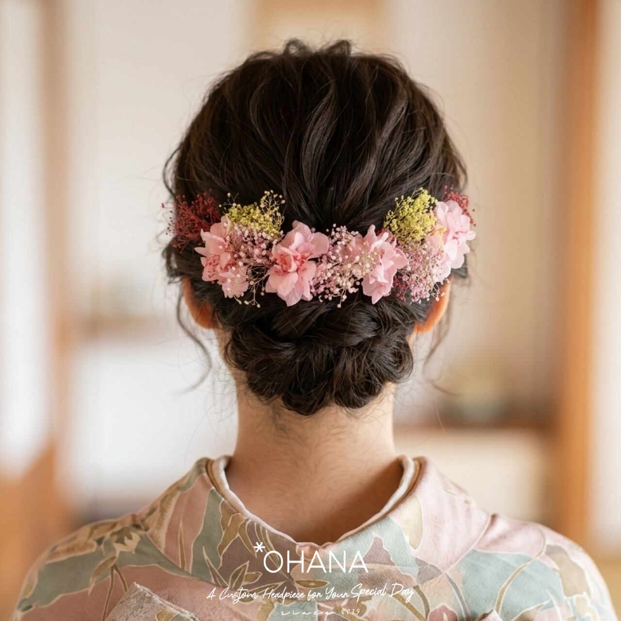 編みおろしやシニヨン、ハーフアップなどお好みのヘアスタイルに合わせてお花を思う存分に散りばめてご使用いただけます。