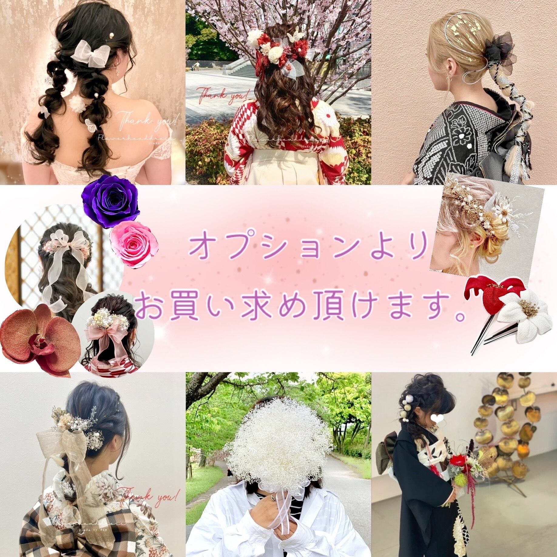 成人式の振袖、卒業式の袴、結婚式(和装・ドレス)、前撮り、発表会など。