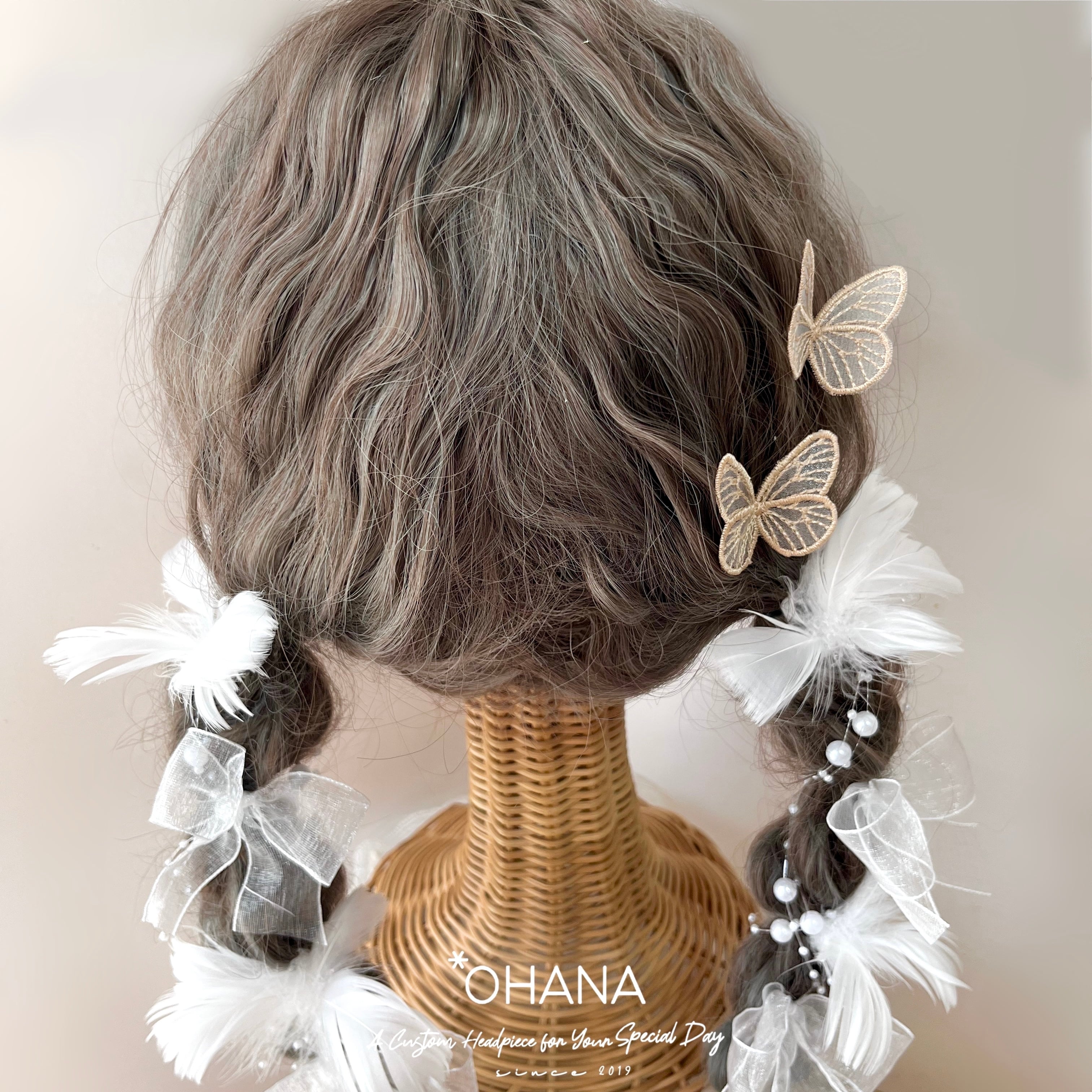 透け感のある「刺繍の蝶々」とふわふわの「羽飾り」を組み合わせたトレンド感たっぷりの髪飾りセットです。