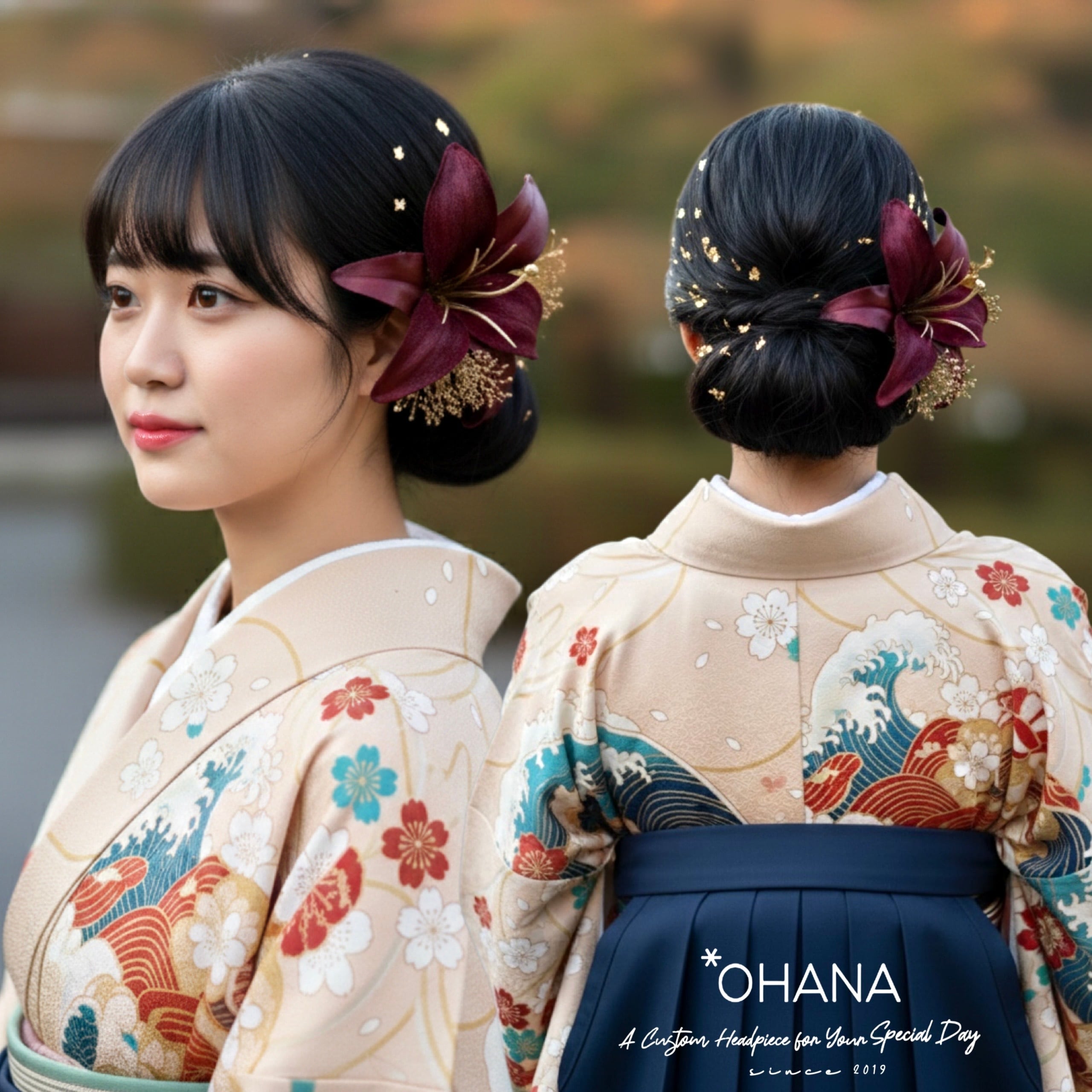 深みのあるボルドーの百合が凛と咲く大人上品な髪飾り