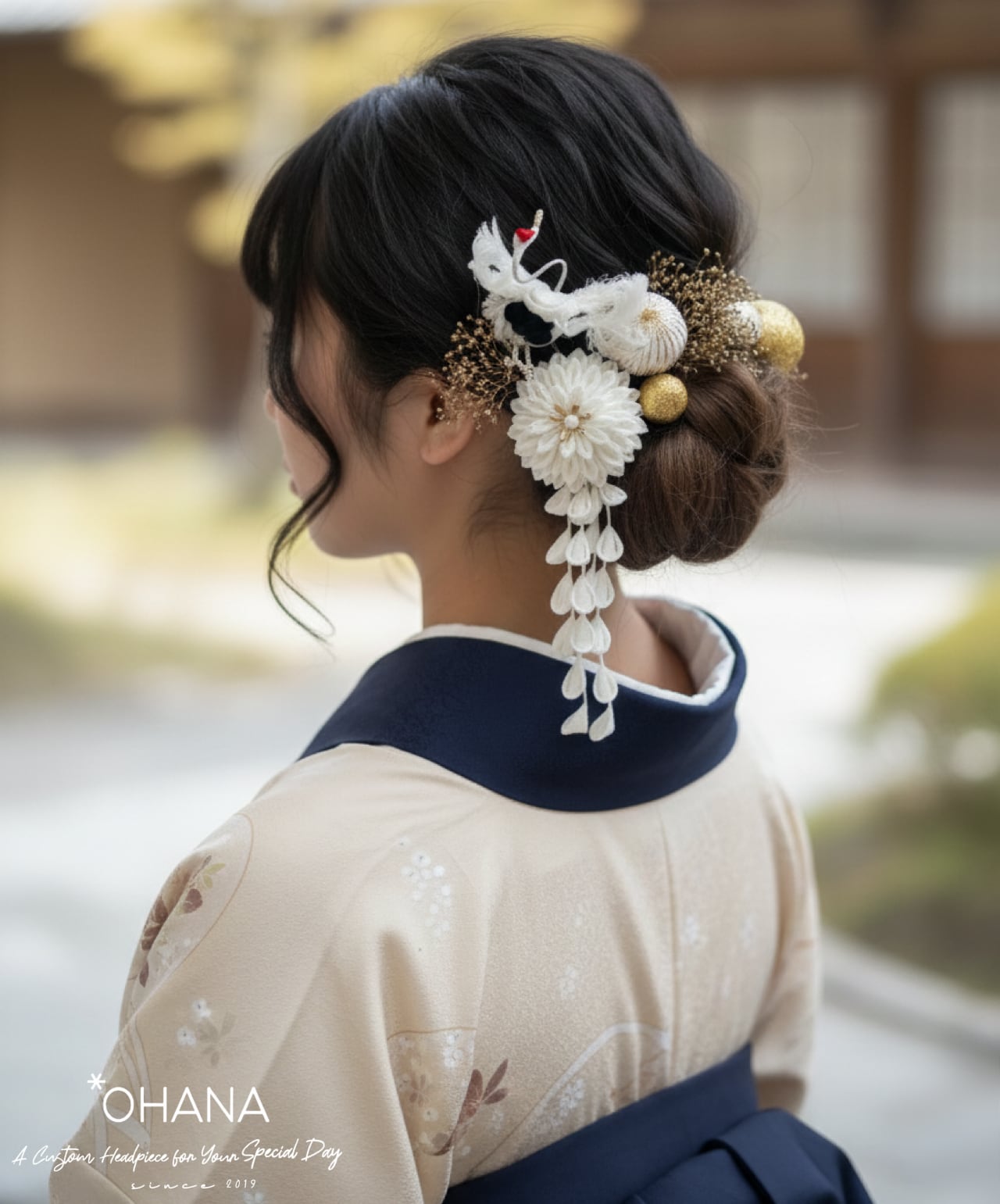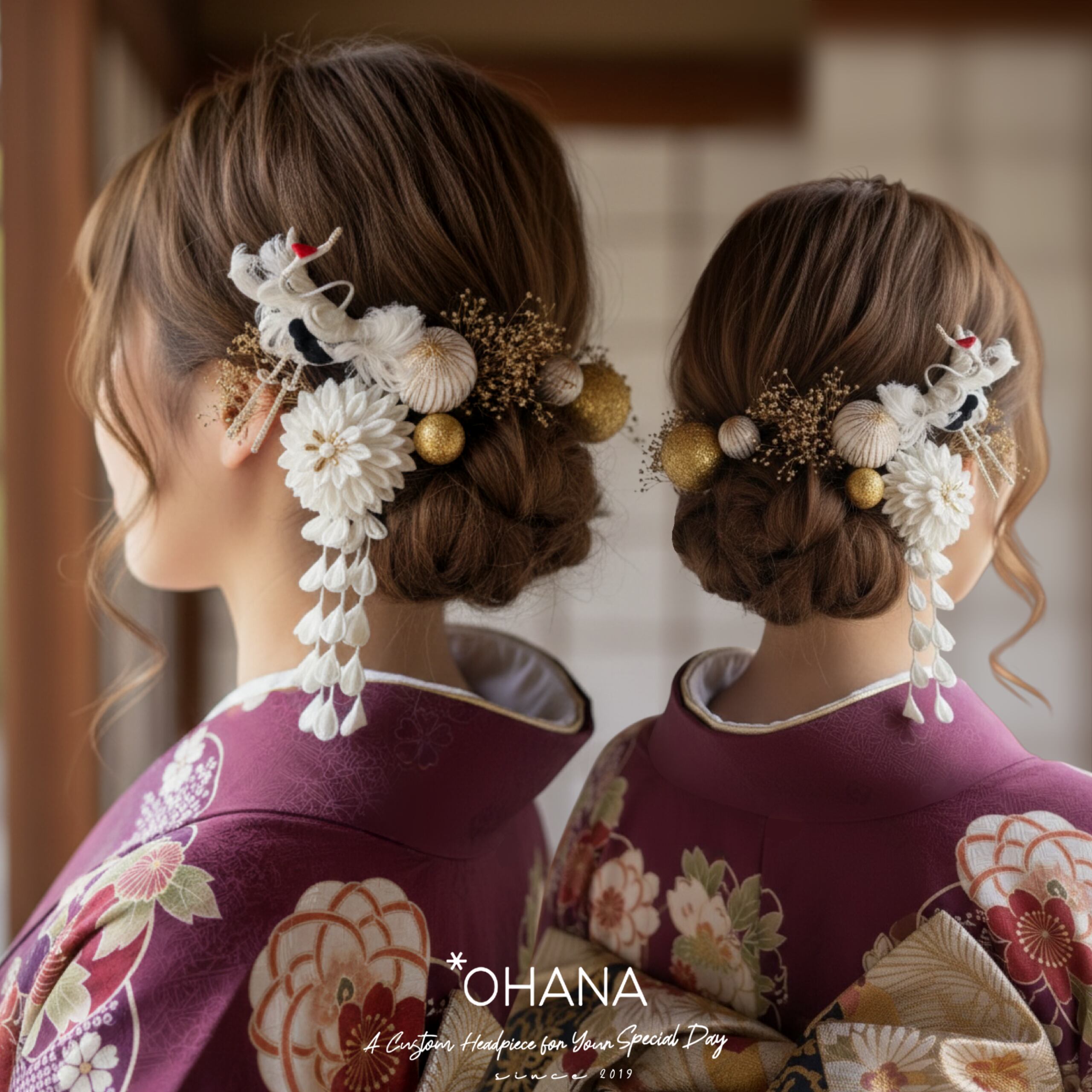 つまみ細工髪飾り #和装小物 #結婚式髪飾り #白無垢 #色打掛 #和装ヘア #前撮り #七五三髪飾り #着物ヘア #ハンドメイド髪飾り #鶴 #縁起物 #金箔ヘア #かすみ草 #和モダン #日本髪 #披露宴 #二十歳 #ハレの日 #オーダーメイド