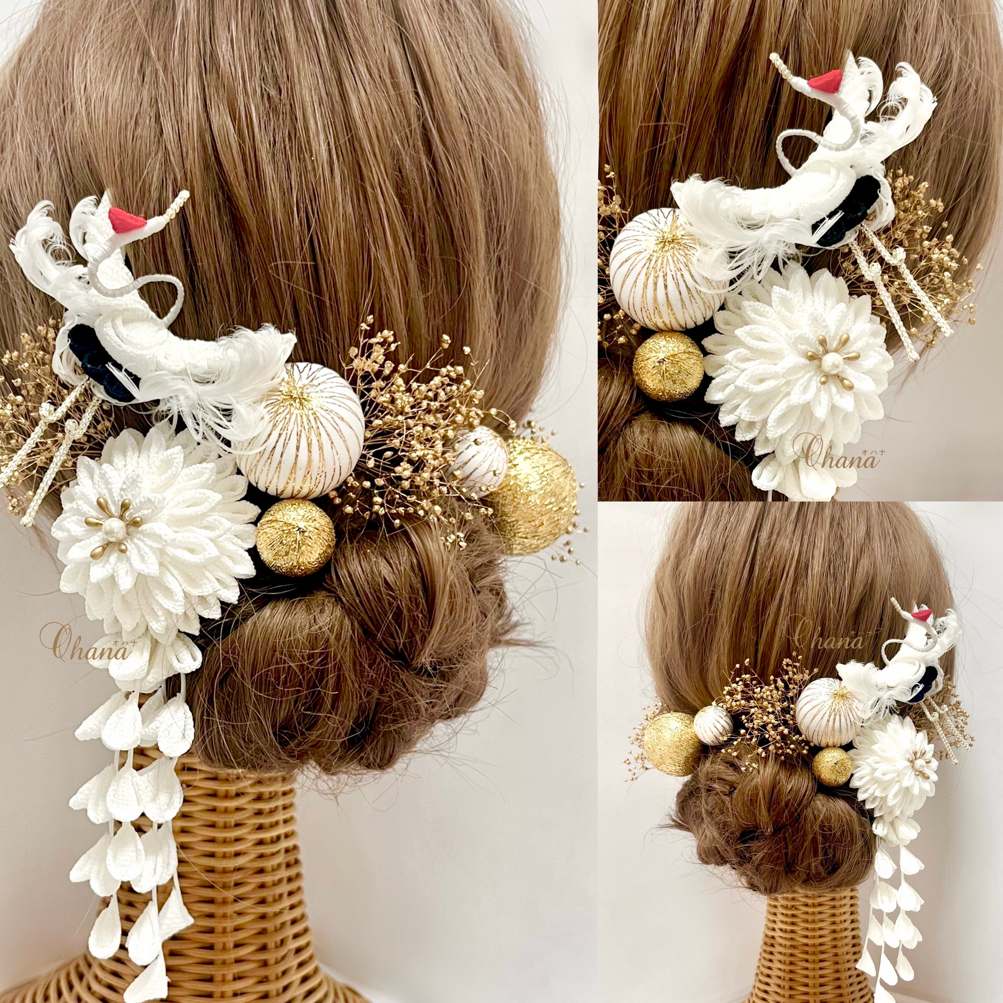【つまみ細工】輝く鶴と白花の髪飾りセット*成人式 振袖 卒業式 袴 結婚式 七五三 8点セット