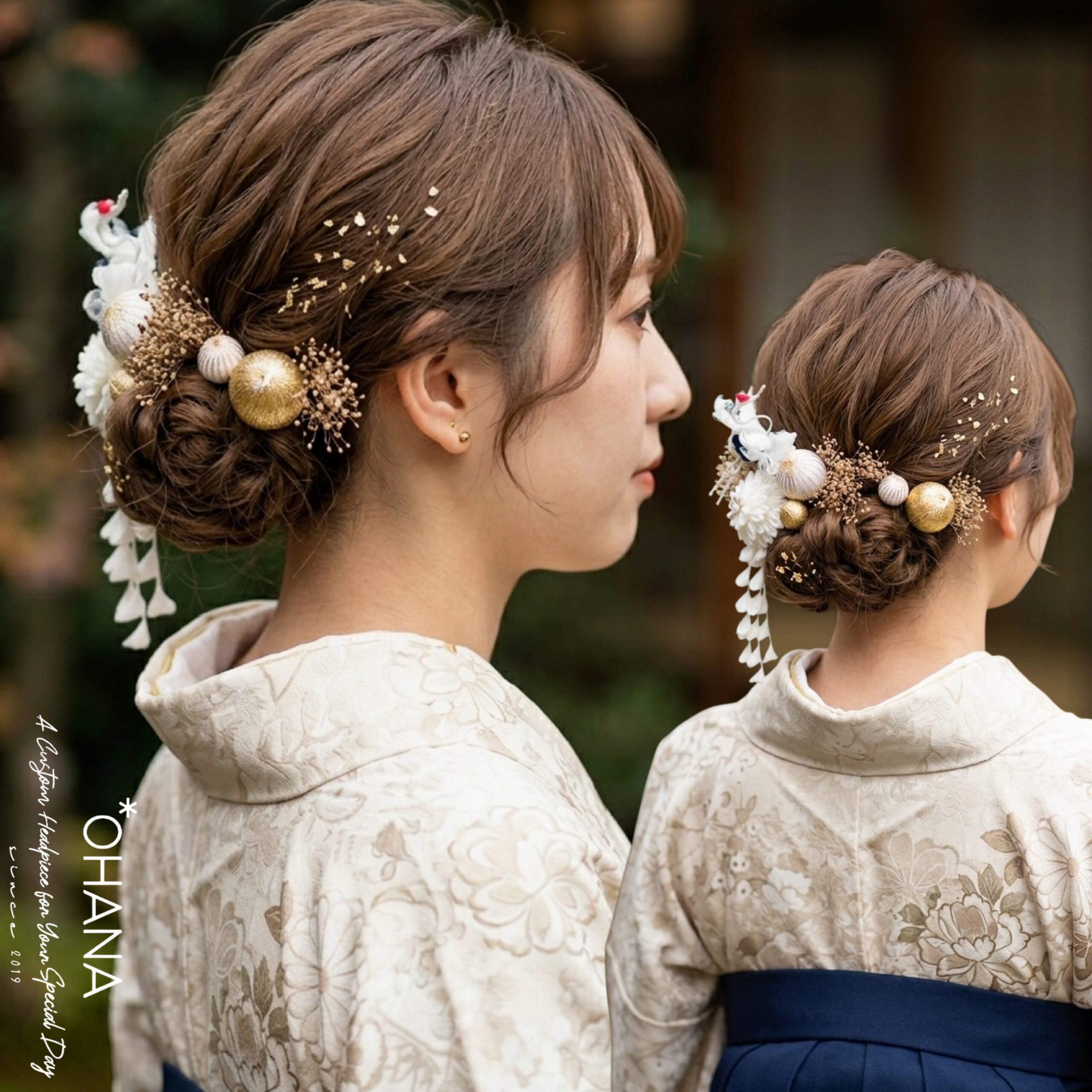 金糸をあしらった和玉や煌めくかすみ草(ゴールド)を組み合わせ、現代的なヘアスタイルにも馴染む和モダンなデザインに仕上げました。